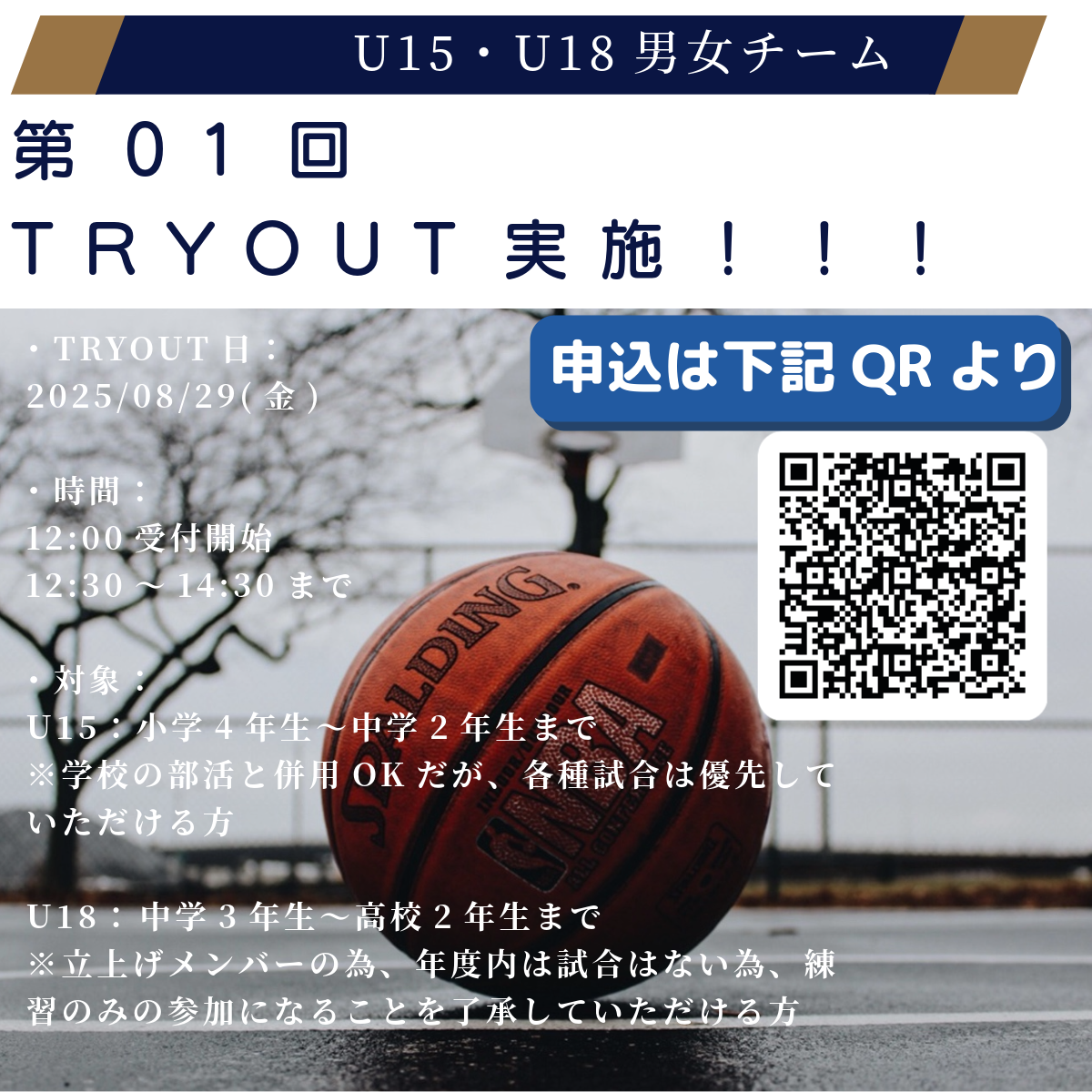 2025年08月29日(金)に当チームの「U15」「U18」男女のTRYOUTを実施いたします。